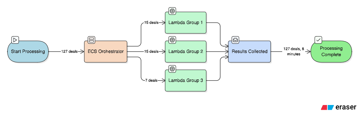 We started with a familiar failure mode: 127 deals, an estimated 63.5 minutes of processing, and Lambda's hard 15-minute timeout. The job was terminated at 14:58, after only 29 deals had been processed.