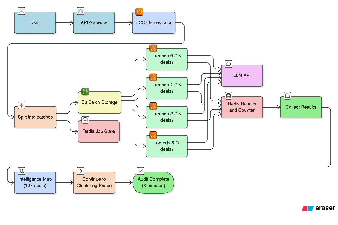 Once all batches are complete, ECS reads the results from Redis and builds a canonical structure — an intelligence map keyed by deal ID: