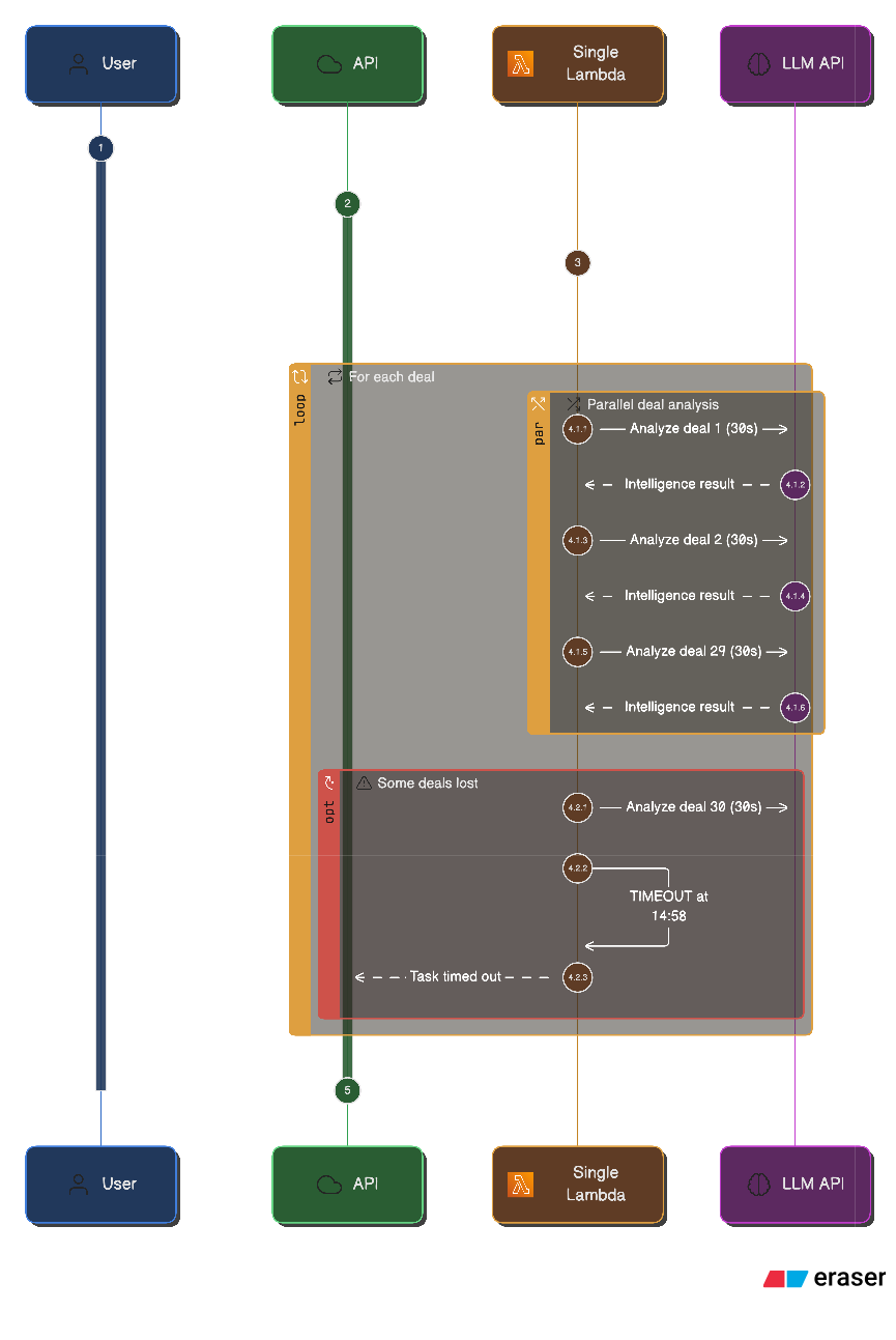 50 deals × 30 seconds per deal equals roughly 25 minutes — well beyond Lambda's 15-minute timeout. The batch never finishes.