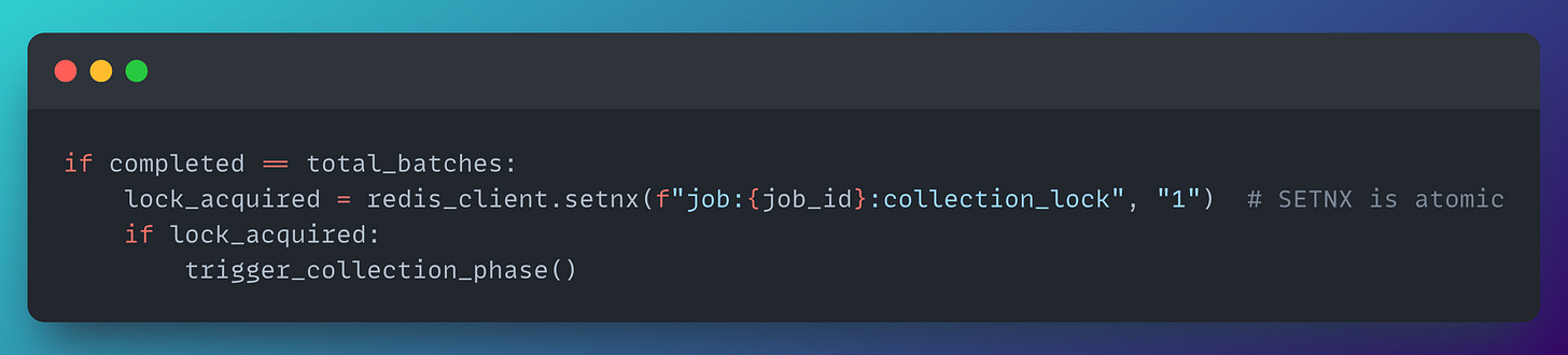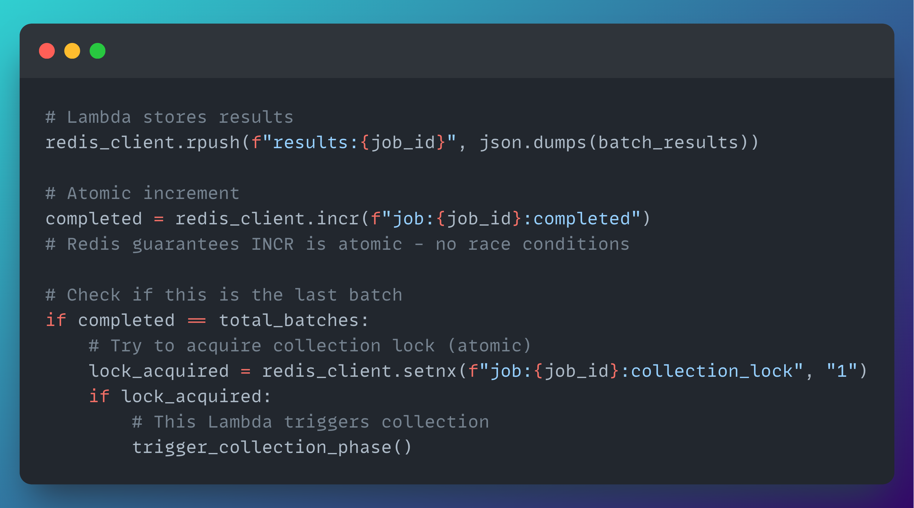 Redis coordination — atomic counters for reliable completion tracking with no race conditions