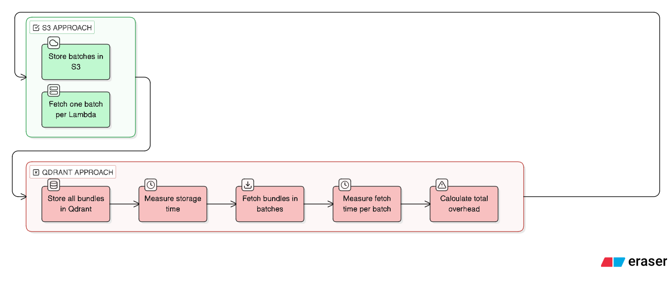 S3 batch storage — eliminates Lambda’s 6 MB payload limit and replaces the failed Qdrant approach