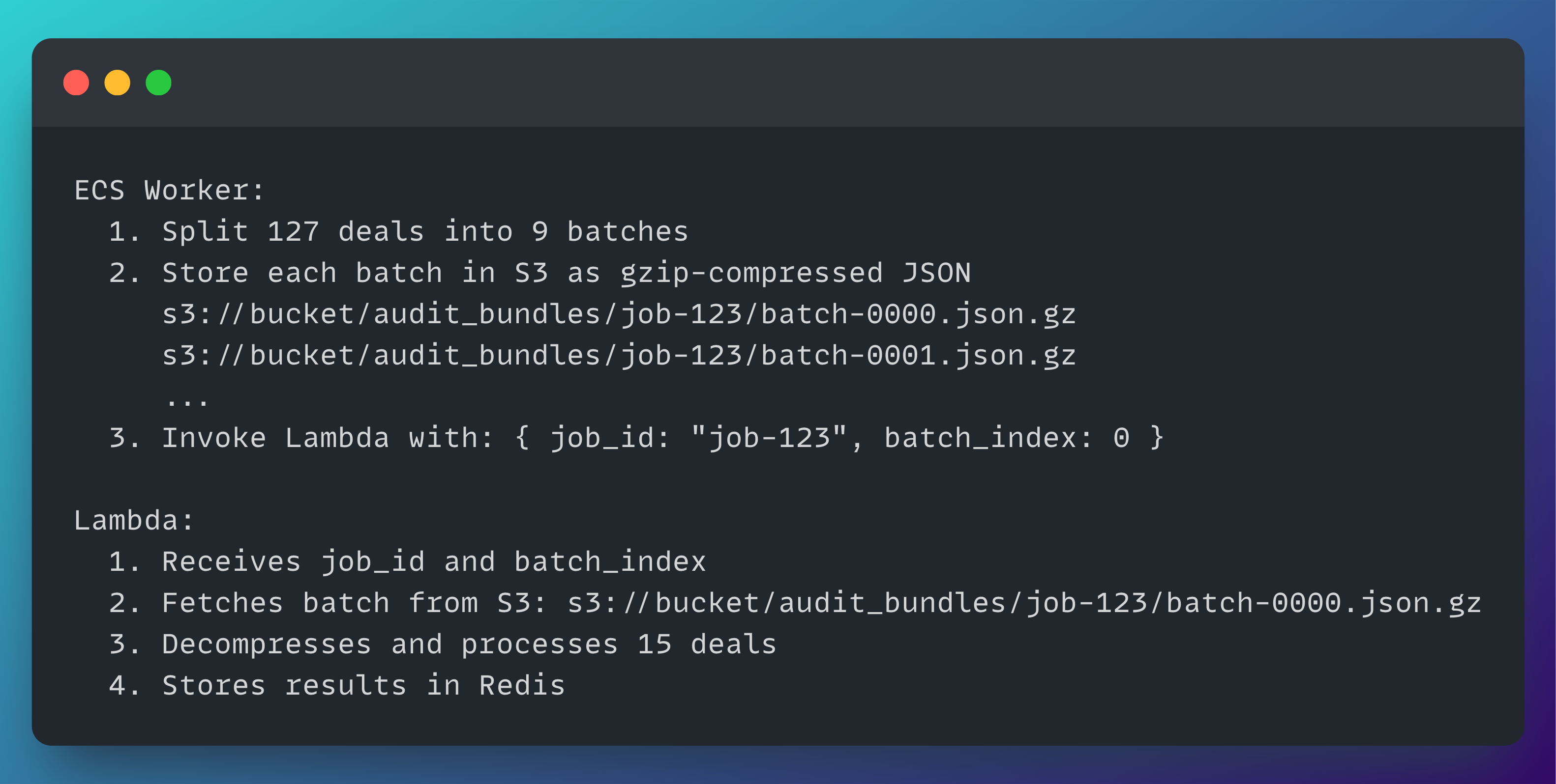 Each Lambda processes its assigned batch independently, while ECS remains alive to coordinate progress and handle the next steps.