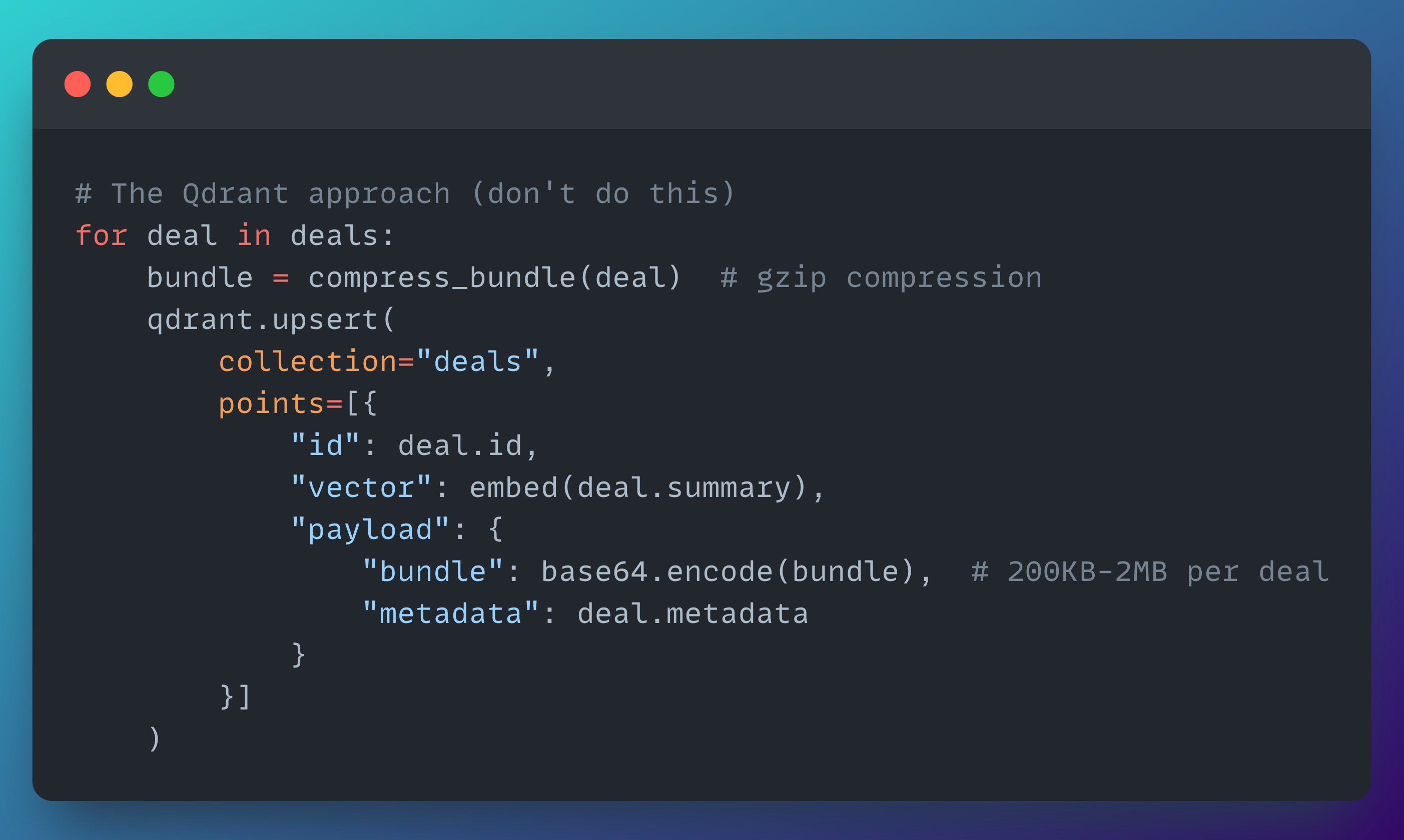 Qdrant stores vectors and payloads, so why not attach the full deal bundles as payloads alongside their embeddings?
