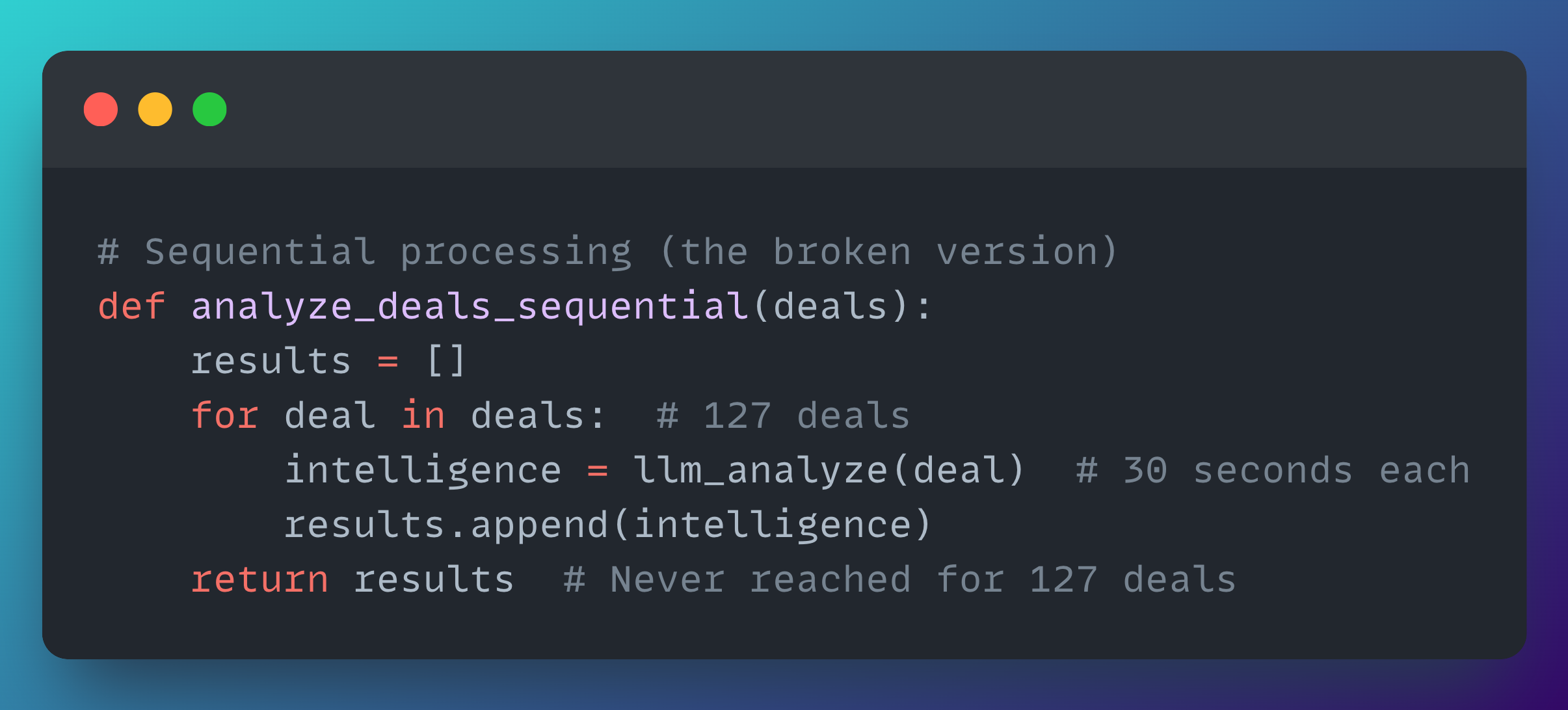 LLM calls are slow - 25 / 35 seconds per deal. Sequential processing stacks wait times.