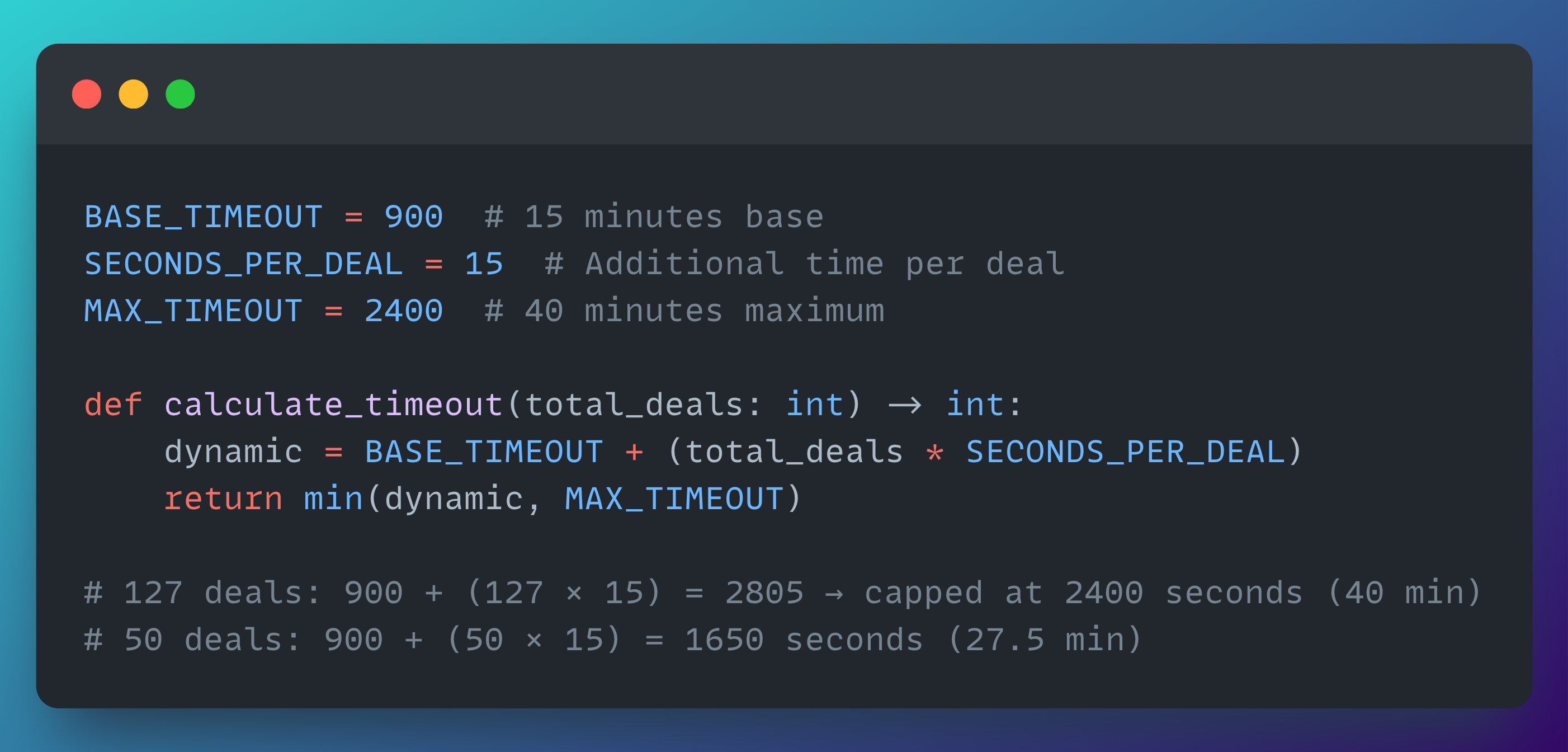 In practice, job duration scales with workload size. A pipeline with 127 deals might finish in 8 minutes. One with 500 deals might legitimately need 25 minutes. A fixed timeout either wastes time (waiting far too long for small jobs) or fails early (cutting off large jobs that would have completed).