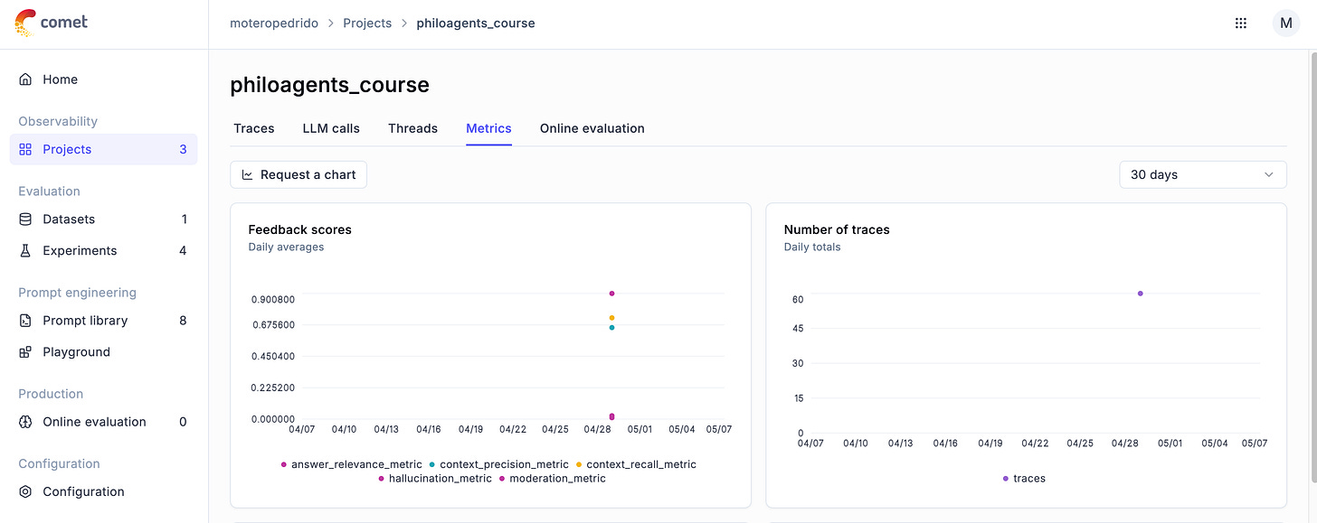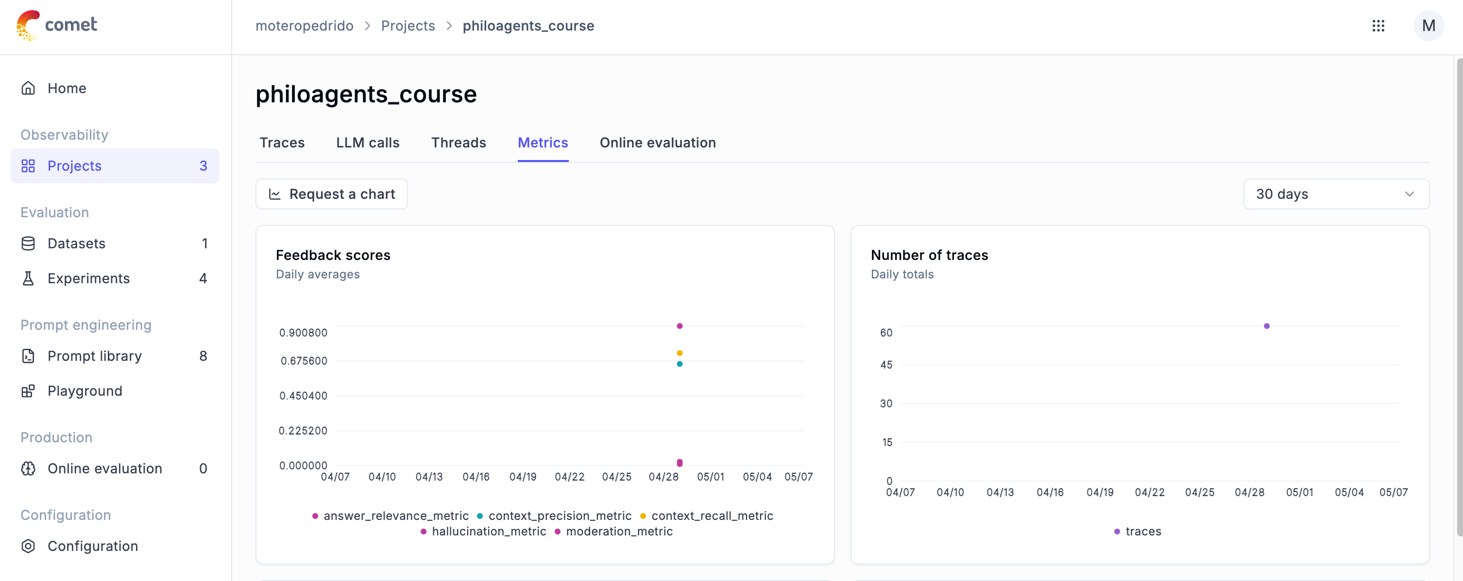 Once the evaluation is complete, you’ll get a panel showing all the metrics from your experiment. If you head to Projects → Metrics, you’ll also find a plot of the daily averages, which is super useful for tracking your app’s performance over time.