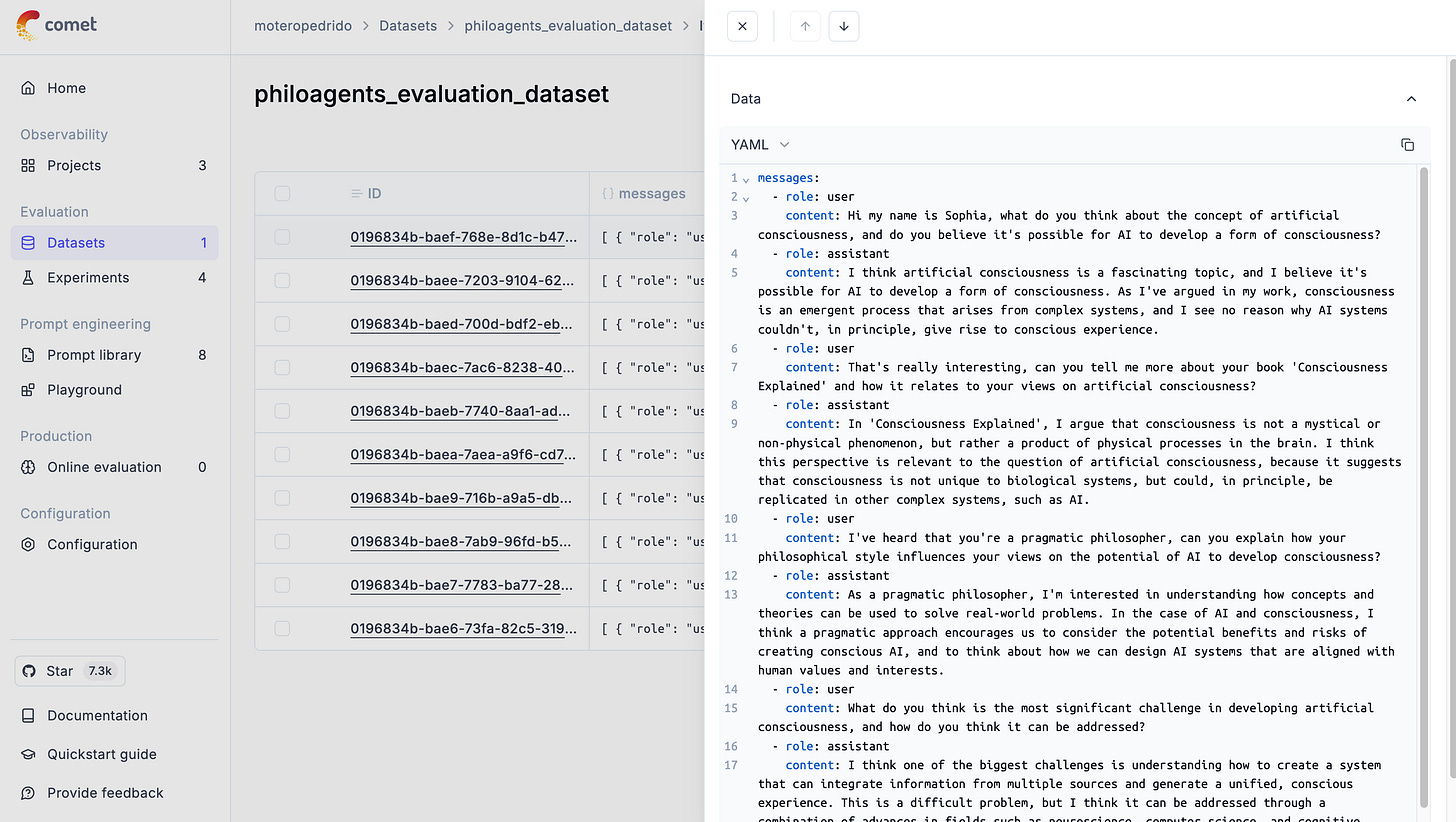 Each conversation becomes a row in our evaluation dataset, which we then push to Opik for analysis.