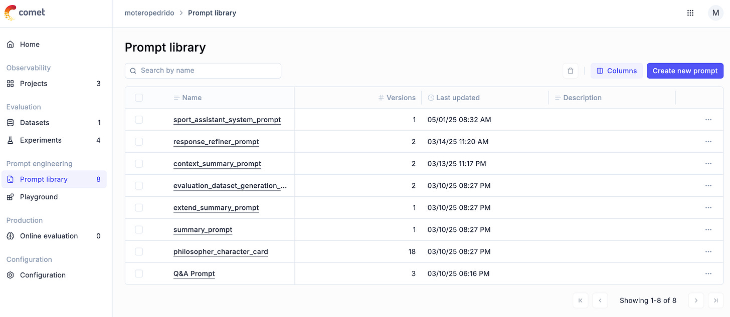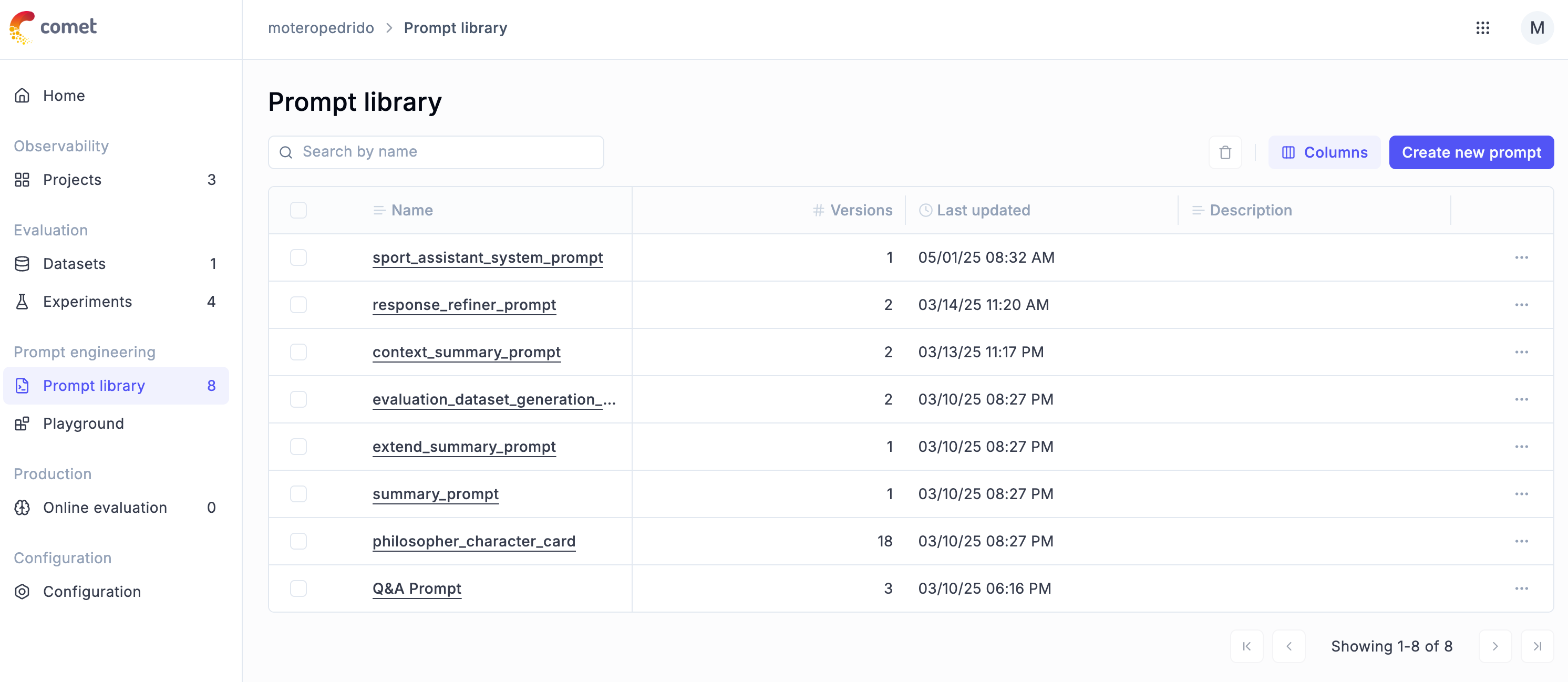 Once you fire up the PhiloAgents app, head over to your Opik dashboard, and under the Prompt Library tab, you’ll see something like this: