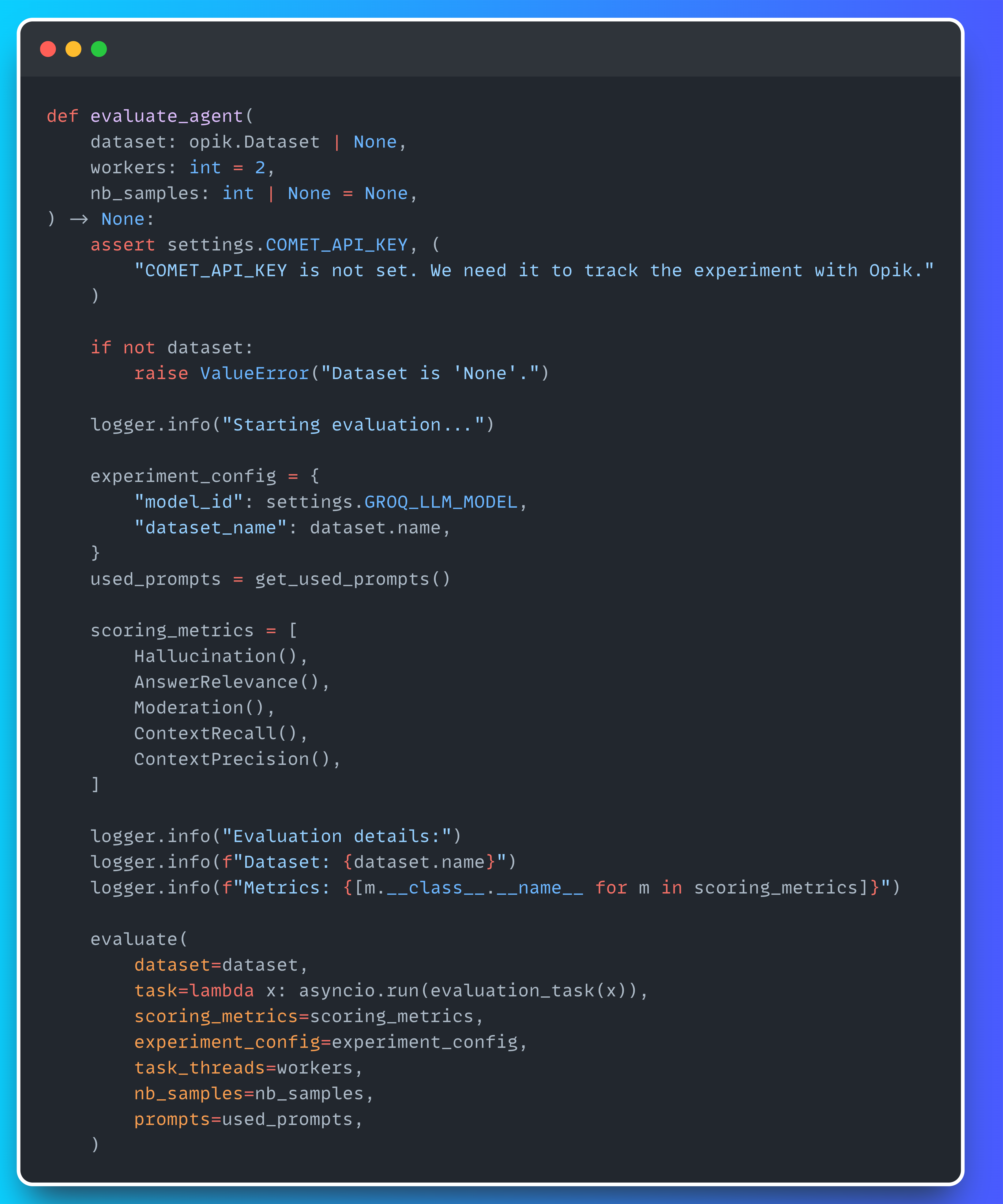 You’ll find all the evaluation logic in our evaluate_agent method—see the snippet below.