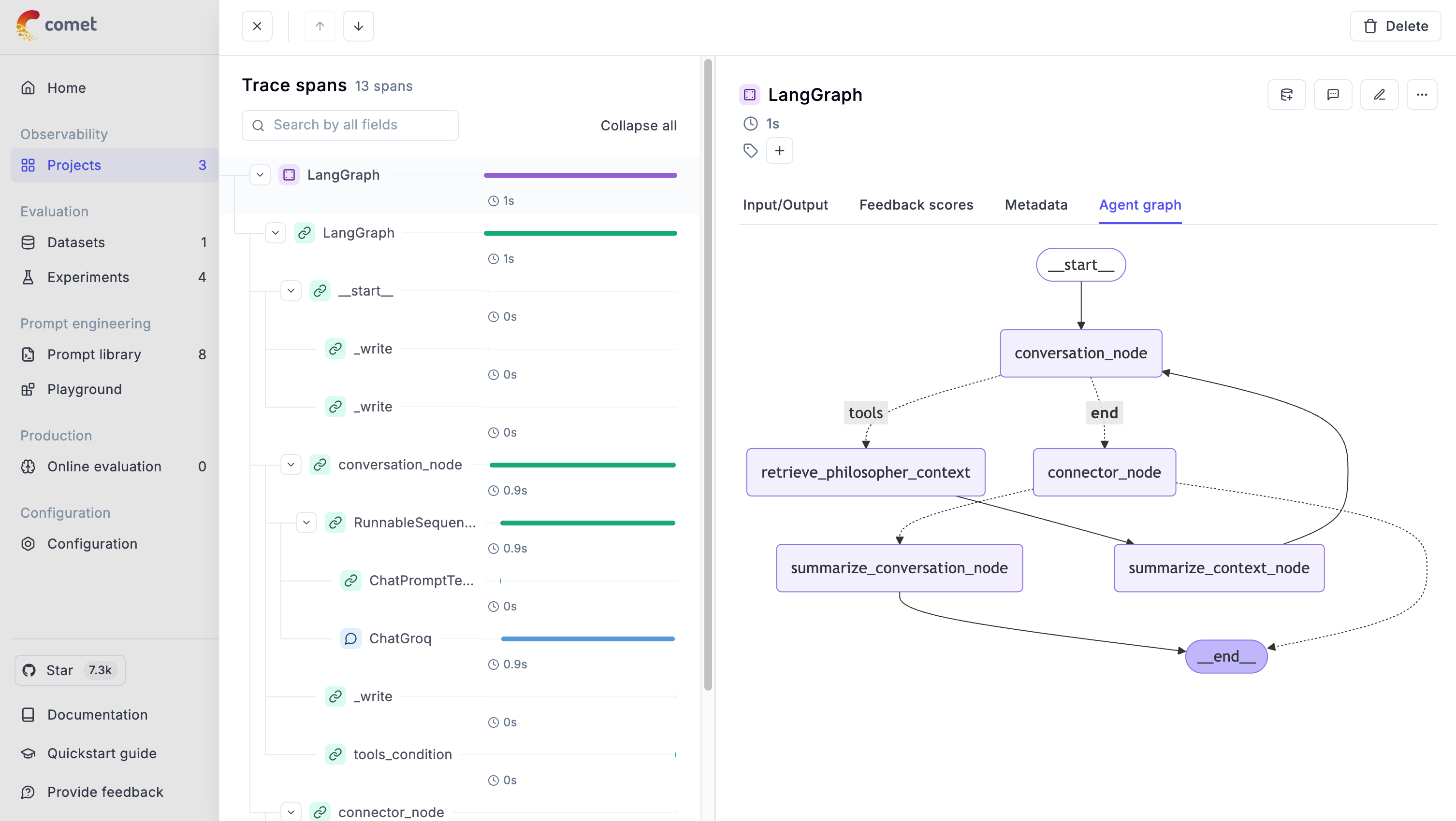 In the Traces tab of the Opik dashboard, you’ll see a full breakdown: each node called, total execution time, time per node, inputs, outputs, and even the graph structure itself.