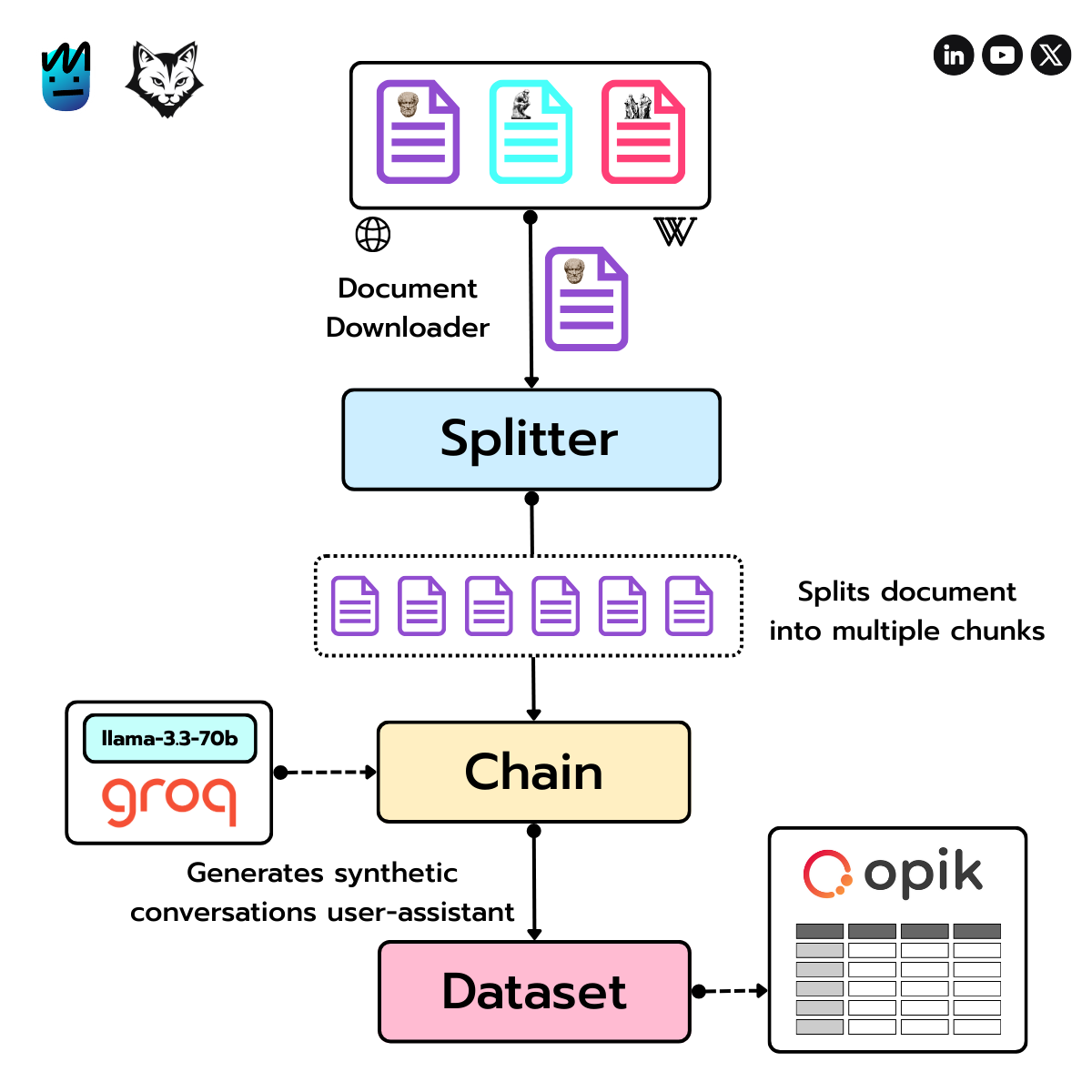 Then comes the fun part: we run a chain powered by Groq’s LLaMA 3.3 70B to generate synthetic user–assistant conversations based on those chunks.